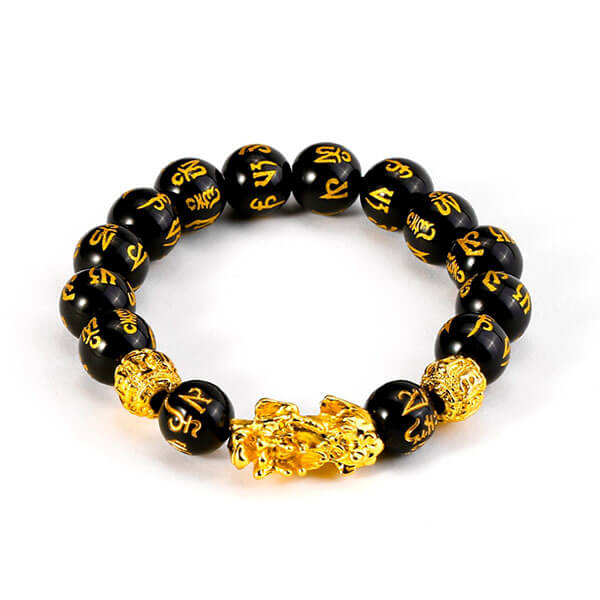 Il braccialetto è decorato con una statuetta della creatura Pixiu che è stata usata per migliaia di anni come amuleto per attirare il benessere finanziario.